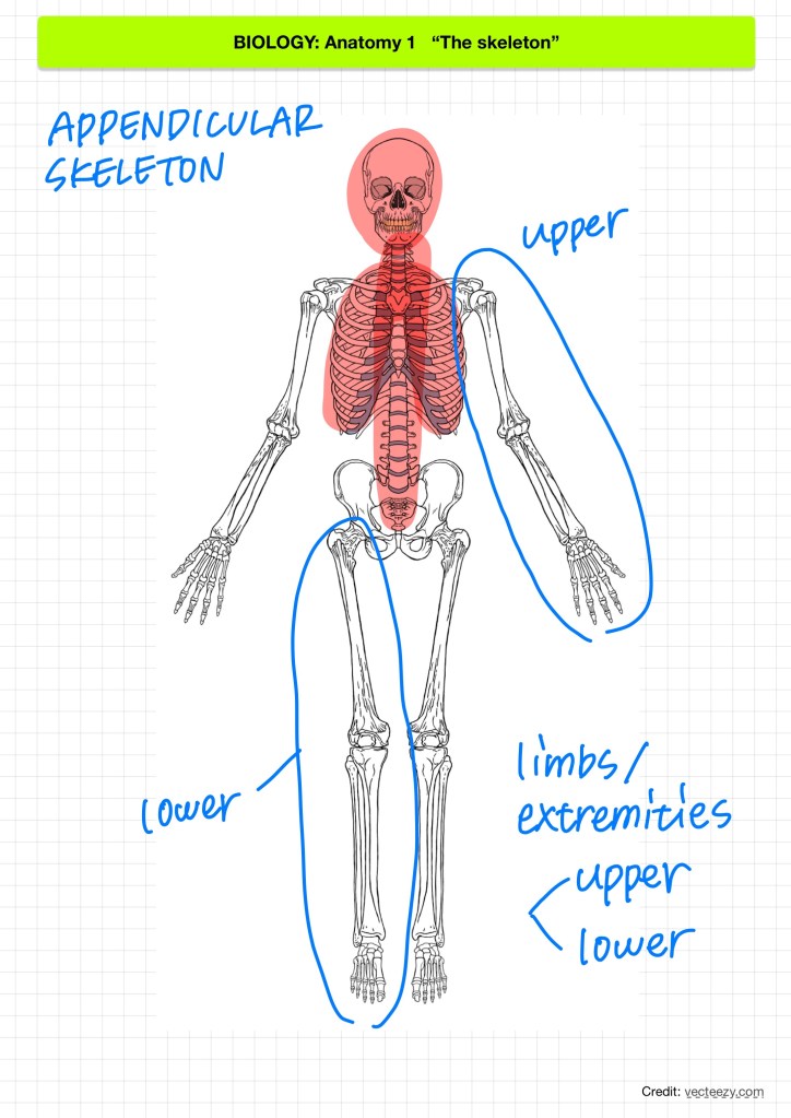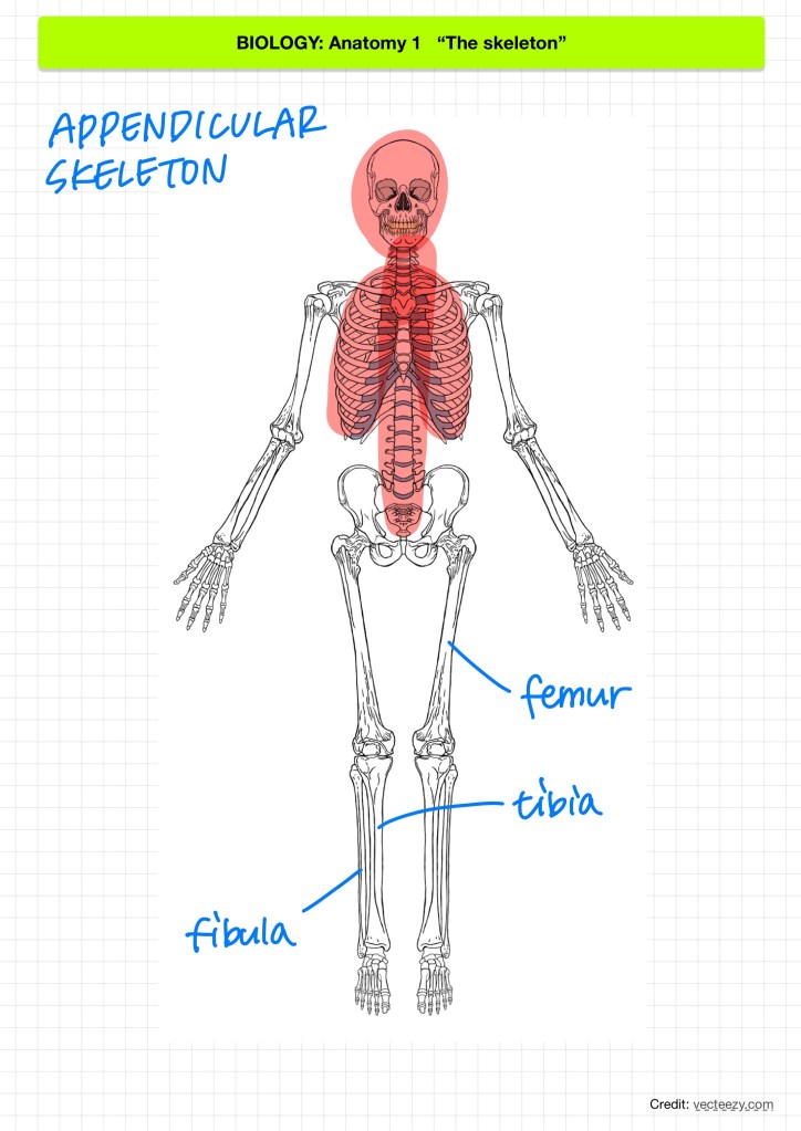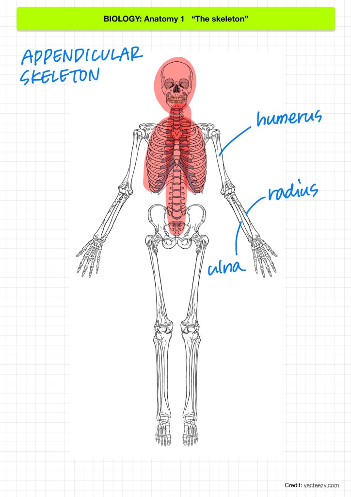 ①Axial skeleton: skull, vertebrae, ribs, sternum