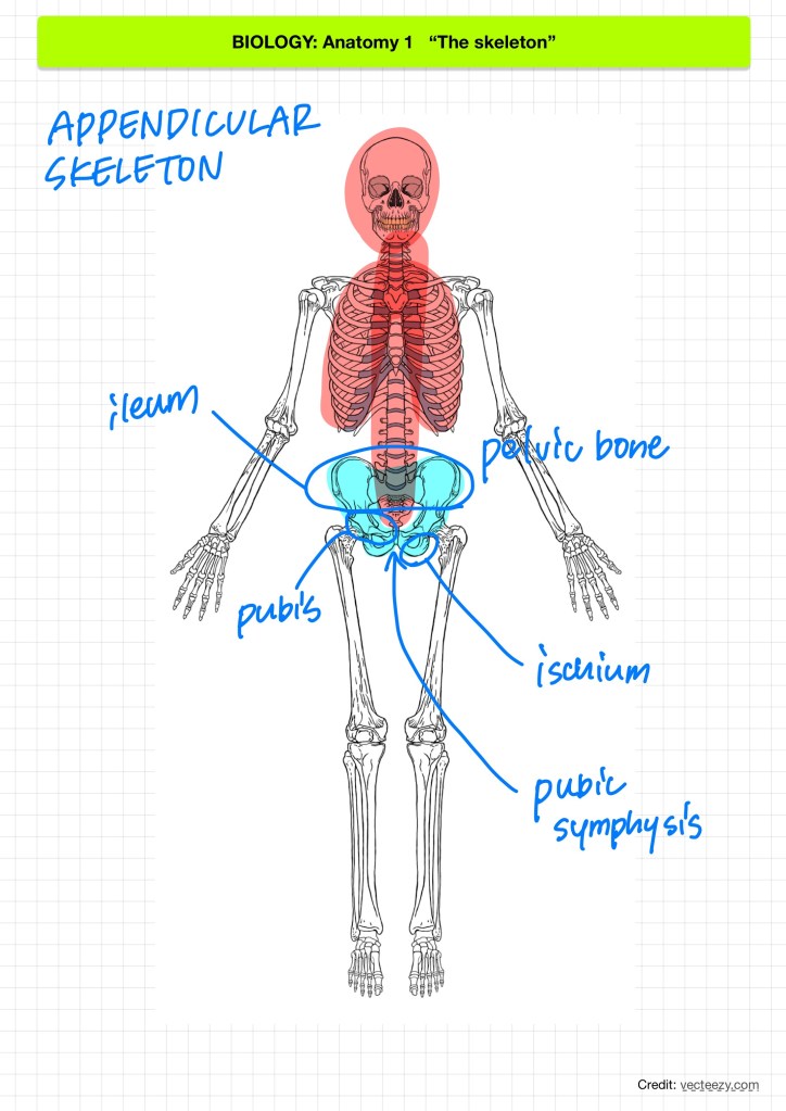 - pelvic bone = ileum, pubis, ischium (+ pubic symphysis)