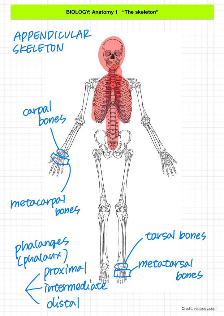 - hand/foot = carpal/tarsal bones + metacarpal/metatarsal bones + phalanges (proximal/intermediate/distal)