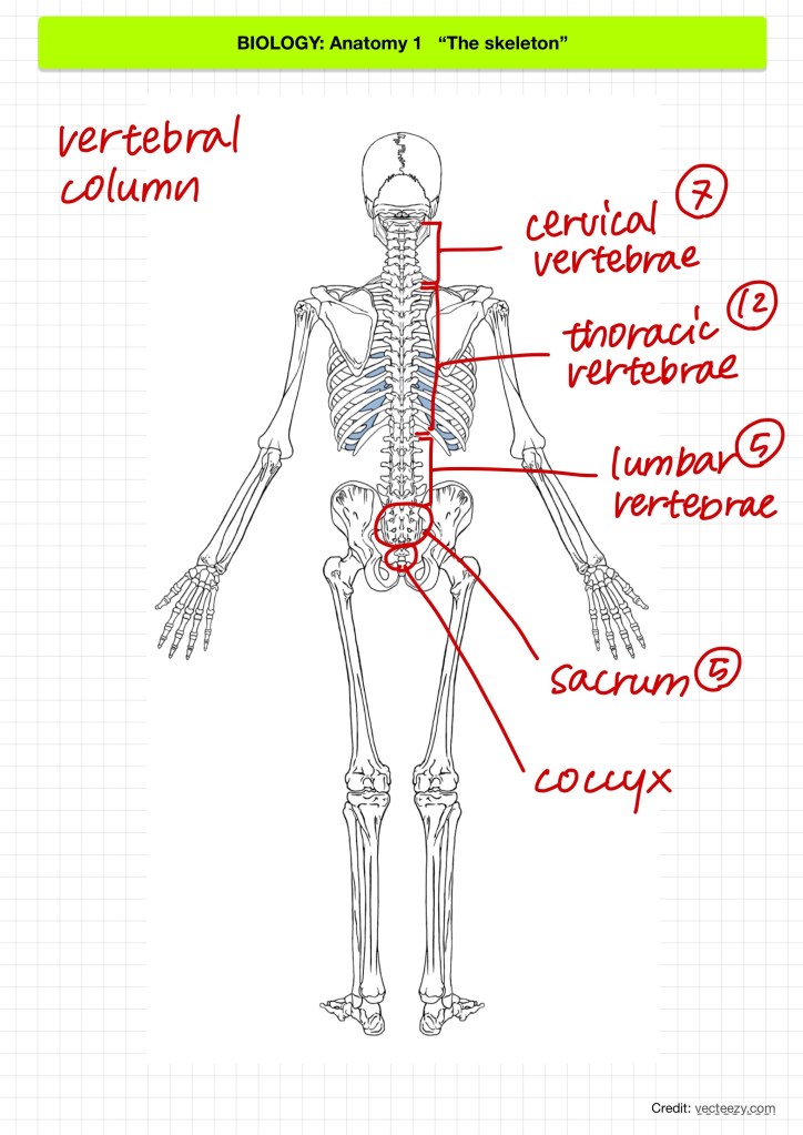 - vertebral column は cervical (C1-C7), thoracic (Th1-Th12), lumbar (L1-L5) vertebrae, sacrum (S1-S5), coccyx の5つに分けられる