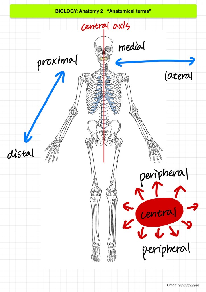 - Proximal (中心から近い) vs distal (中心から遠い)